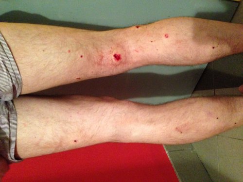 vous trouverez ci-joint une photo de mes jambes prise le 22 février au soir. Les impacts sont dues à une grande assourdissante qui a explosé juste derrière moi. Des morceaux étaient incrustés dans la peau. Ma veste en cuir est également pleine de trous. Je suppose que l’utilisation de cette grenade ne s’est pas faite selon la réglementation en vigueur.