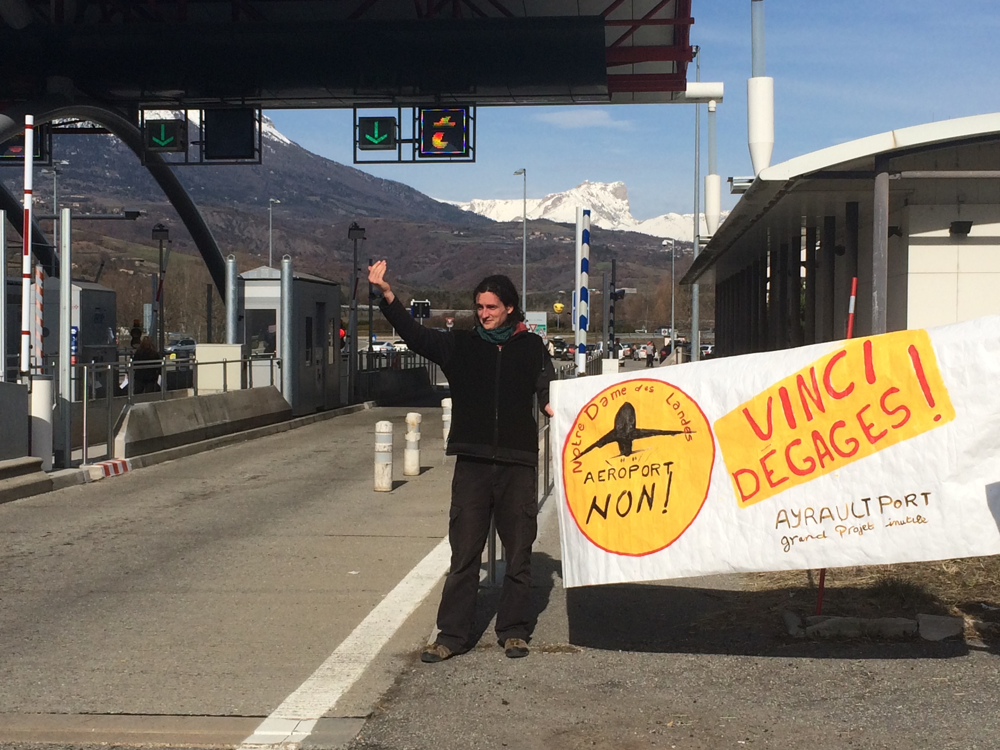 Nous avons menée une action de soutien à la ZAD ce samedi 20 février de midi à 13h au péage de Tallard, avant Gap. Nous avons à huit assuré la gratuité des péages afin de taper là où ça fait mal, dans les poches de Vinci. Et des voitures, nombreuses, nous en avons vu passer. Certains veillaient vers les barrières levées, deux autres distribuaient des tracts, deux tenaient la banderole et les deux derniers brandissaient un feuillet péage gratuit et désignaient les trois couloirs à emprunter. Une autre action de ce type devait se dérouler le même jour vers Salon de Provence. Ce type d’action est à développer pour faire lâcher Vinci.