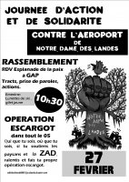 " (...) Nous devons montrer à tous les pro-aéroport, dans les institutions et dans les conseils d’administration, que nous sommes nombreuses et nombreux et prêt-e-s à nous organiser afin d’empêcher toute évacuation de la ZAD. La Fédération Anarchiste, dont certains groupes et militant-e-s sont impliqué-e-s dans les collectifs locaux, soutient cet appel (à mobilisation) et participera à la mobilisation. Rendez-vous sur la ZAD de NDDL le 27 février, afin d’enterrer définitivement tout projet d’aéroport et d’évacuation de la ZAD !"