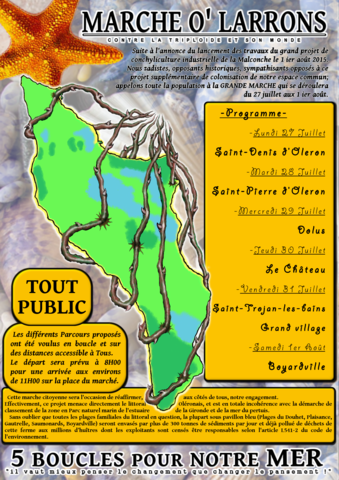 ZAD d’Oléron : Suite à l’annonce du lancement des travaux du grand projet de conchyliculture industrielle de la Malconche le 1er août 2015, Grande marche O’Larrons contre le projet de conchyliculture industrielle du 27 juillet au 1er août