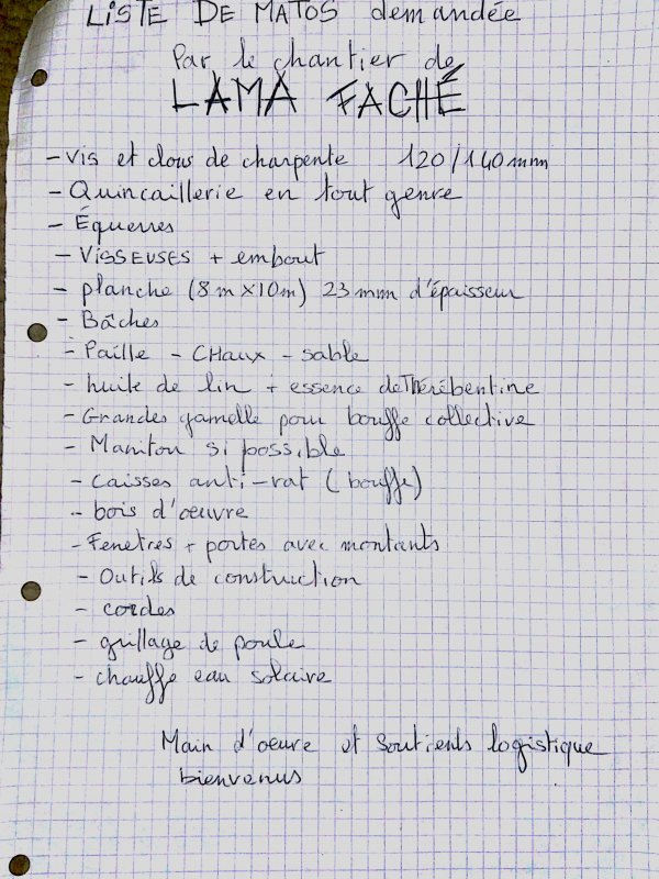 Et pour les suites du chantier de reconstruction à Lama Fâché, voici une petite liste non-exhaustive de matos qui pourrait aider à la reconstruction d’un espace collectif.