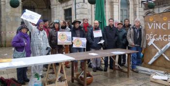 Au programme : vin chaud et gateaux, chorale « Les Barricades » interprétant des chansons de la Zone A Défendre, diffusion de tracts sur le marché, et à nouveau concours des grands projets inutiles et nuisibles, où Vinci gagne le tracto-trophée à tous les coups, le tout sous une banderole « contre l’Ayrault-Port, l’A51, le TAV ».