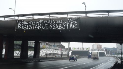 Dans la nuit du dimanche 20 au lundi 21 janvier, dans le cadre des journées d’actions contre Vinci, nous avons accroché à la sortie de Paris, sur un pont de l’autoroute A3 situé à Bagnolet, une grande banderole sur laquelle est écrit "La ZAD est partout ! Vinci dégage, Résistance & Sabotage".