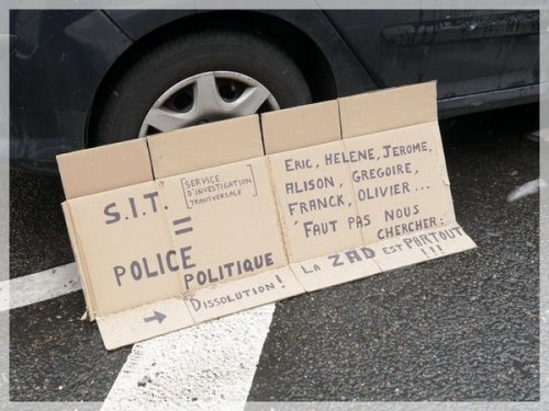 La pancarte (les prénoms sont ceux des flics du SIT : spéciale dédicace)