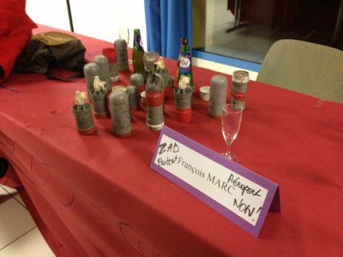 La seconde action de la journée était prévue à partir de 19 h, un rassemblement pacifique devant l’espace F. Mitterrand, en centre ville de Pont de Buis où devait se tenir une assemblée générale des élus socialistes du Finistère. Quelques nouvelles têtes rejoignèrent le premier cortège et la porte de la salle prévue étant ouverte, une grande partie des manifestants s’installa au premier étage, en effectuant une agréable re-décoration de la salle (voir photos) à base de divers produits NOBELSPORT ramassés sur la ZAD, afin que les élus puissent admirer la dangerosité de ces engins...
