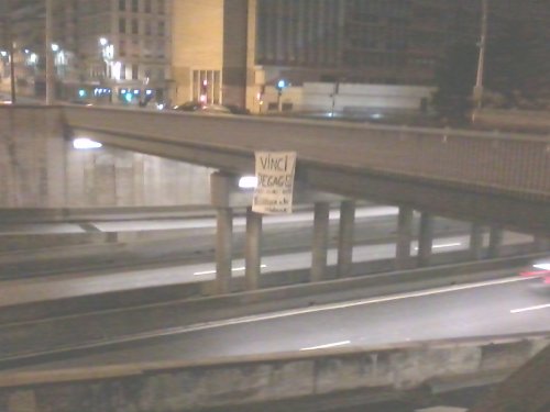 Nous avons posé une banderole à Lyon, au niveau de Perrache, à l’endroit où les voitures rentrent dans Lyon (en venant depuis Marseille/St-Etienne [A7]).