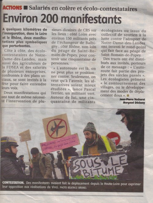 "Manifestations en marge de l’inauguration Trois manifestations attendaient le ministre et les nombreux élus à l’occasion de cette inauguration. Outre des adhérents de la FDSEA de la Loire et des salariés de l’entreprise Decamp Jalla de Balbigny, actuellement en cours de fermeture, une soixantaine de militants "anti Nôtre-Dame-des-Landes et anti béton" ont manifesté pour dénoncer la politique de Vinci, notamment sur le projet de l’aéroport nantais"