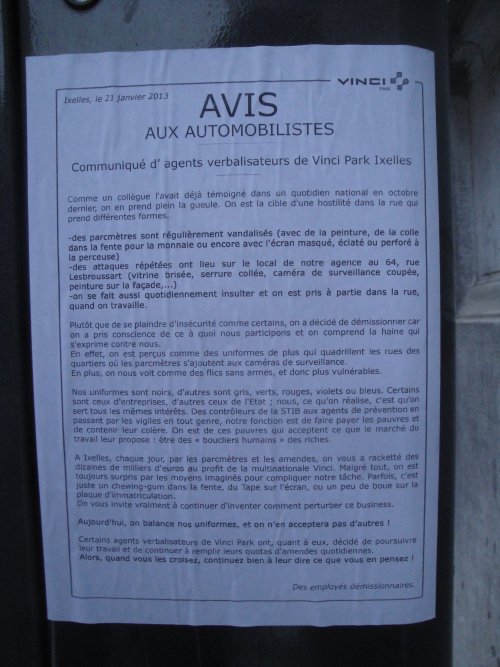 Opération réussie ! Plus de 2h de blocage de barrières, et un beau défilé : clients d’abord, heureux pour une fois de ne pas avoir à payer ; flics, municipaux pour commencer, qui nous ont prévenu que si ont bougeait pas ils appelleraient "les autres" ; journaliste du journal local (Courrier Picard), très heureuse d’avoir quelque chose a dire pour demain ; une huissier de justice de Vinci, avide de chercher des dégradations qui n’existaient pas, mais qui a prit une photo de plaque d’immatriculation d’un client du coup parti sans payer ; et "les autres", les gros méchants... qui nous ont demandé quand nous comptions partir SVP, parce que quand même, on les avait pas prévenu ! Pour finir, les RG, en retard car ils nous attendaient ailleurs !