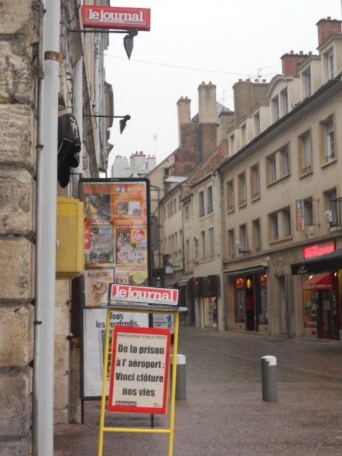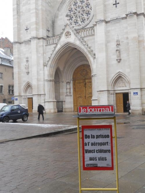 Ce vendredi 18 janvier 2013, dans le cadre des deux journées d’actions contre Vinci, une ballade a déambulé Besançon. Plusieurs affiches, dénonçant la collaboration étroite entre la Ville de Besançon (PS) et Vinci ont été collées à proximité des chantiers du futur tramway qui, tout comme l’aéroport de Notre-Dame, nous a été imposé. Eurovia, filiale de Vinci, travaille activement à la construction de ce transport pour « bobos » et consommateurs (rajoutons le fait que les lignes du tram rejoignent les zones commerciales entre elles). D’autre part, la ville fait également intervenir Vinci pour « restaurer » la fac de lettres, en décomposition avancée depuis de nombreuses années.