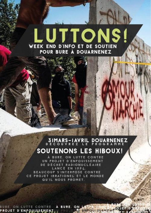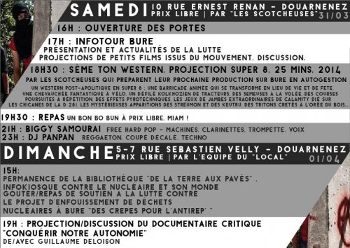17h : Infotour Bure Présentation et actualités de la lutte (nouvelles des comités de soutien locaux, perspectives pour les temps à venir), projections de petits films issus du mouvement, discussion.