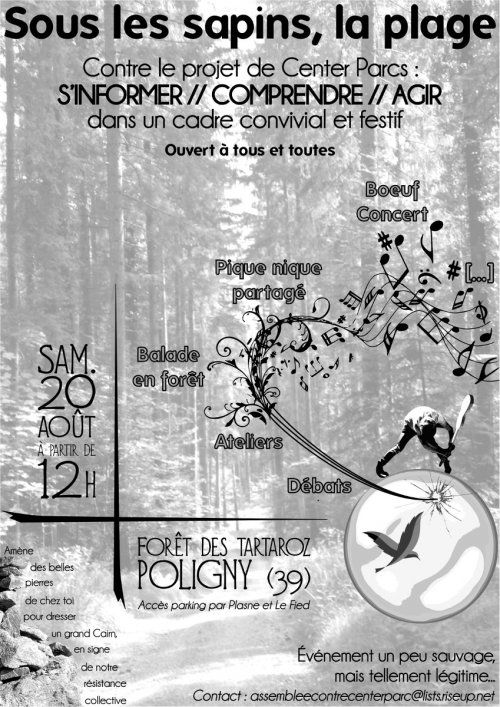Depuis quelques mois, les collectivités supporters de Pierre & Vacances — de la nouvelle Région, au Département, en passant bien sûr par la municipalité de Poligny et la Com’com’ — font des pieds et des mains pour sortir le projet du bourbier post-Débat public, à coups de centaines de milliers d’euros... Ce 20 août, nous invitons à une journée de mobilisation conviviale sur le site convoité pour montrer notre opposition déterminée à ce projet d’aménagement capitaliste, hors sol et imposé, et poursuivre la construction d’un mouvement d’opposition à Center Parcs dans le Jura.