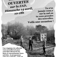 PORTES GRANDES OUVERTES sur la ZAD, Dimanche 14 avril, 10-18h Une vingtaine de collectifs vous accueilleront pour vous faire découvrir les lieux et vous présenter leurs activités. Au programme selon les endroits : visite de jardins ou d’ateliers, balades, discussions, dégustations... Si vous restez la journée, prévoyez un pique-nique à partager ! Et préférez le vélo, car la zad c’est grand ! (Carte à télécharger ci dessous) ( Affiches et dépliants sont dispo à l’accueil de la Rolandière !) Ce même (...)