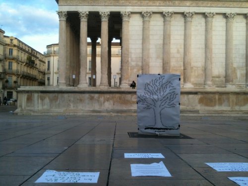 - Nimes : retour sur la manif d’aujourd’hui, 15h à la Maison Carrée. "Nous sommes une petite centaine autour de nos affichettes collées par terre. Les bougies ne restent pas allumées, trop de courants d’air. Les passants s’arrêtent, lisent, discutent, tout ça dans le calme. Pas d’uniforme en vue.... A 18h on lève le camp, la nuit tombe."