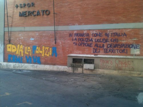On peut lire : "En france comme en italie, la police tue celleux qui s’opposent à la dévastation des territoires" (si je ne me suis pas trompé). Et au dessous, une plus vieille inscription : "Chiara, Claudio, Nico, Mattia". Ce sont les noms des inculpé-e-s de terrorisme de la lutte NO TAV en val di susa.