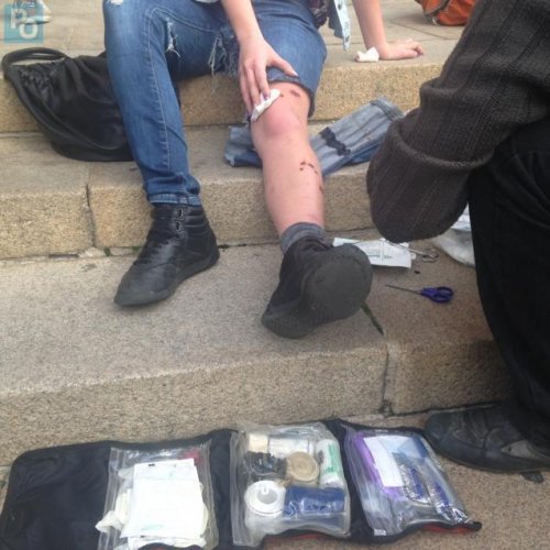 "j ai régroupé sur le parvis 3 personnes ayant recu des éclats de la grenade de désencerclement que les flic on lancé, sans sommation, au milieu du cortege, rue de strasbourg. la personne blessée sur la photo a recue la grenade entre les 2 jambes, elle a une 20aine de plaie sur les deux jambes. Un éclat était rentré sur 1cm de long (je l ai extrait sur le parvis). je précise que cette grenade a été précédée de 2 sec environ d un coup de gazeuse, qui a fait reculer les gens et immédiatement après elle a explosé, au milieu du cortege, provoquant un mouvement de foule. les personnes présentes etaient en cortege, en train de passer. 2 autres blessé plus légers : brulures de 3 cm de diametre au molet et au ventre, sans éclats"
