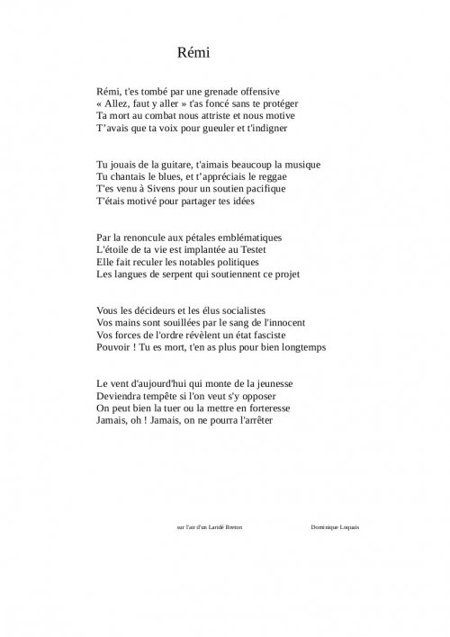Puis l’annonce de la mort de notre camarade, tombé cette nuit tragique sur les lieux où dans l’après midi la vie résistait. « Mourir pour des idées c’est relativement bête » dira plus tard Carcenac dans un communiqué. Rémi avait 21 ans, il a été assassiné par un tir de grenade offensive, il n’était pas venu là pour mourir.