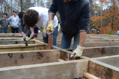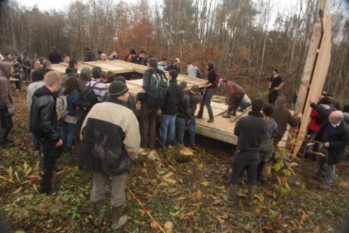 A la fin de la journée, les murs de la cabane de discussion et la cuisine collective sont érigés. On construit aussi sanitaires, dortoirs, atelier et mobilier, et autres petites structures. De nombreuses autres cabanes amenées lors de la journée seront montées dans les jours qui viennent.
