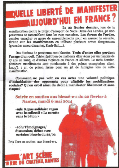 Soirée De Soutien aux blessé(e)s du 22/02/14 à Nantes le mardi 06 mai au café le L’art Scène.! piece jointe : Tract en format PDF