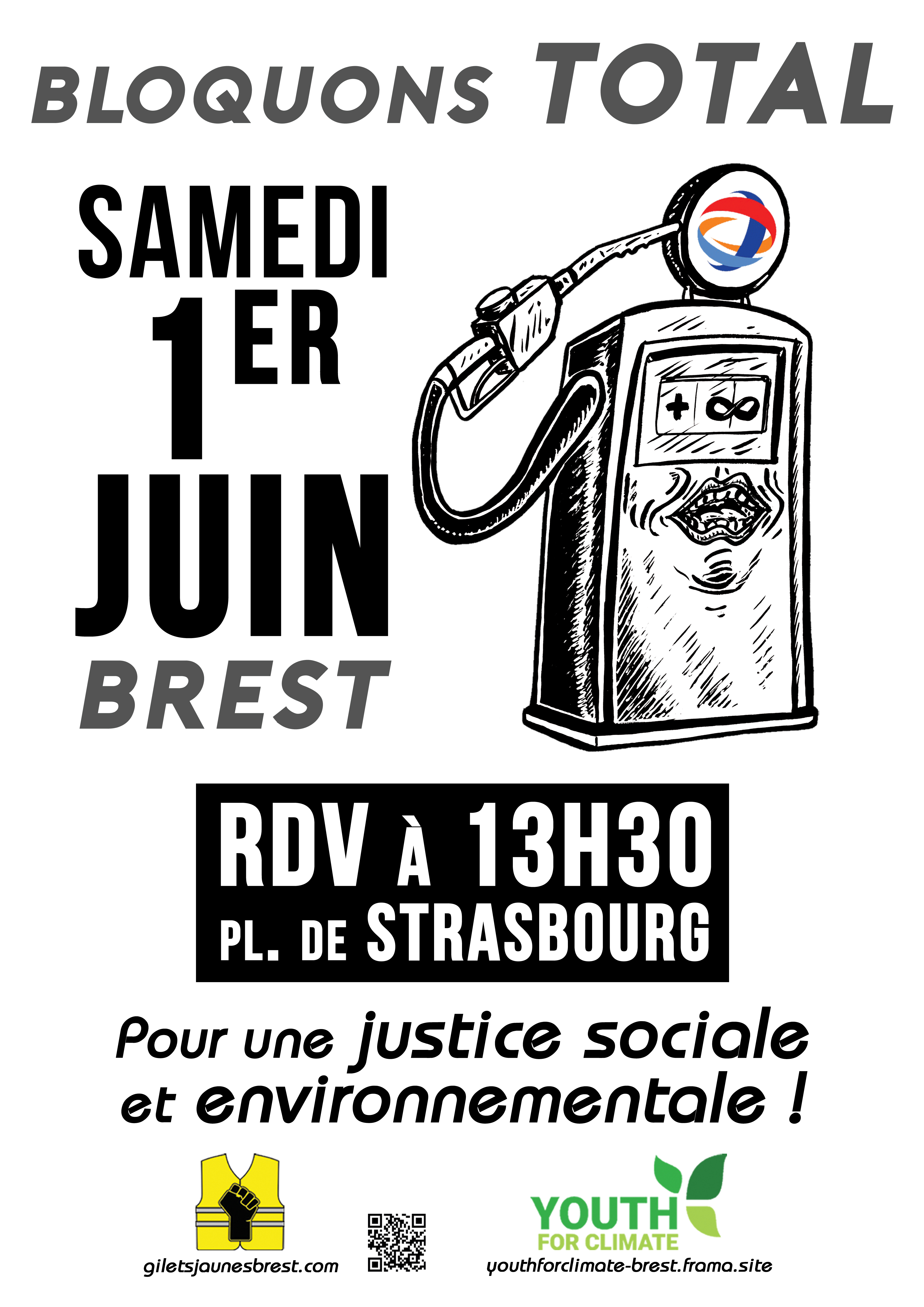 "Arrêtons de nous faire exploiter et polluer par les multinationales, le samedi 1er juin, rejoignez-nous pour bloquer les stations TOTAL !" RDV 13H30 Place de Strasbourg à Brest.
