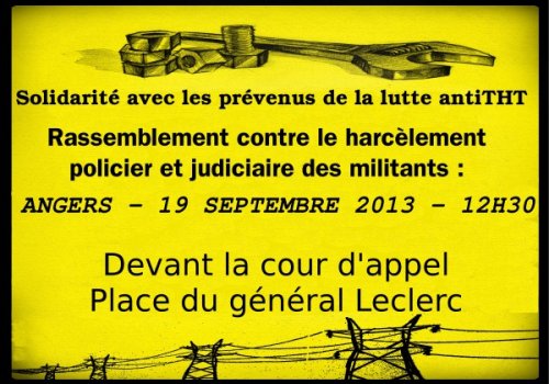 Ce n’est pas l’achèvement de la ligne THT Cotentin-Maine, ni la répression qui l’accompagne (comme avec le procès de ce 19 septembre 2013 à Angers), qui ont entamé notre détermination et notre désir de continuer. Au contraire, car nous pensons que les liens tissés ici et là constituent notre force. En nous organisant ensemble, au-delà des frontières administratives et thématiques, et de nos divergences politiques, nous pouvons non seulement gagner quelque chose mais aussi tisser des amitiés et des solidarités pour pouvoir mieux en faire baver à celleux d’en face, voire y prendre un certain plaisir.