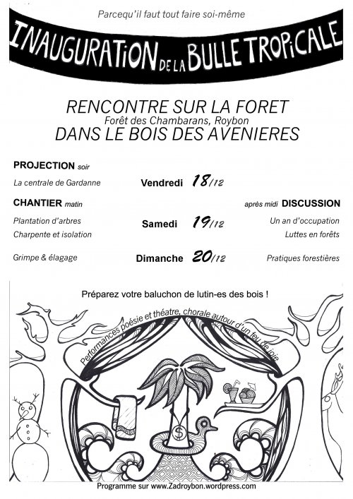 Accueil > Camarades de lutte > Autres luttes contre l’aménagement capitaliste du territoire > Inauguration de la bulle tropicale – Rencontres sur la forêt les 18,19 et 20 (...)