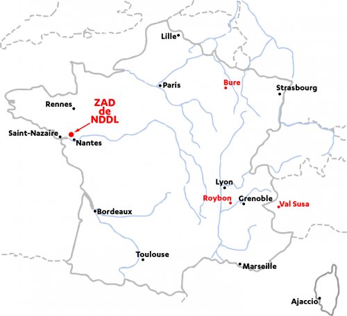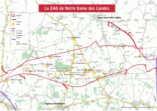 La Zone A Défendre est située à 20km environ au nord de Nantes, sur les communes de Notre-Dame des Landes, Vigneux de Bretagne et Grandchamp des Fontaines. Elle est entre les 2 fois 2 voies Nantes - St Nazaire à l’ouest et Nantes - Rennes à l’est. i