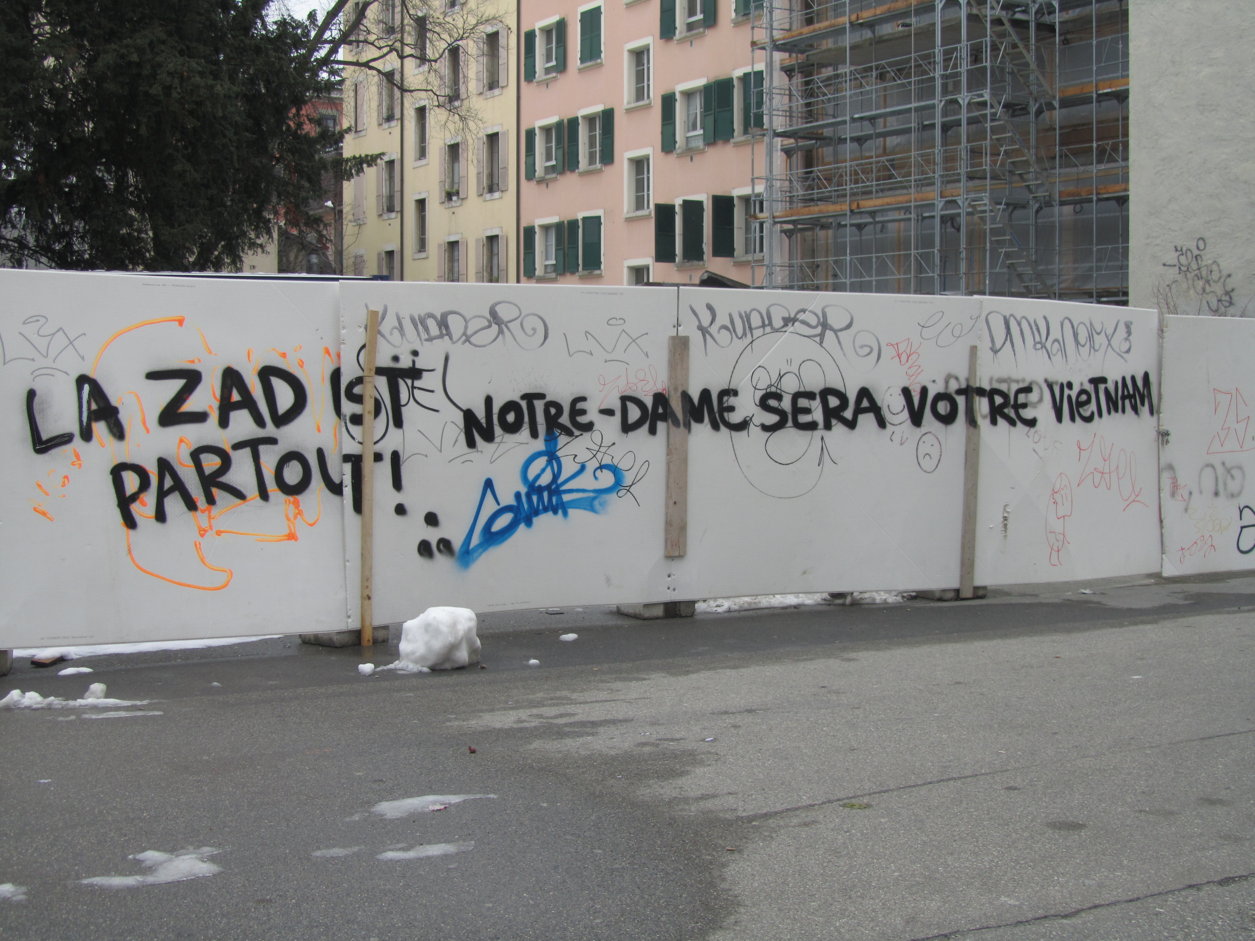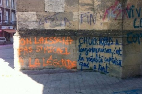 Lors de la Fête des Sans, une fête de rue sauvage qui a rassemblé des centaines de personnes, la basilique Saint-Michel a été taguée avec notamment un message de soutien à la luttre de Notre-Dame-des-Landes.