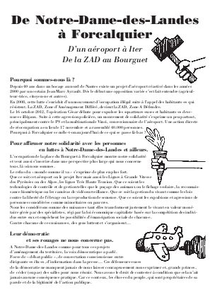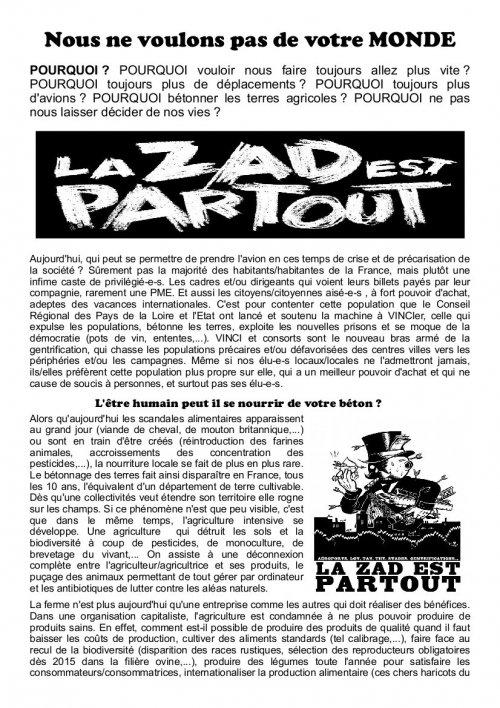 Nous, militantEs de tous âges, agissant en conscience et en accord avec nos principes, exprimons toute notre solidarité avec les inculpéEs et appelons chacunE à nous rejoindre dans notre lutte déterminée contre Vinci et son monde, contre l’aéroport de Notre-Dame-des-Landes et contre tous les autres Grands Projets Inutiles et Imposés !