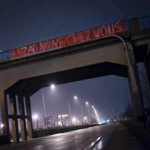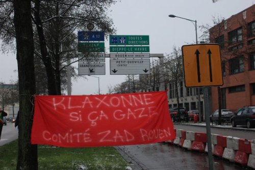 Une banderole « LA ZAD ARRIVE CHEZ VOUS » est en place depuis ce matin sur la façade du pont Quatre Mares de la zone industrielle de Sotteville-les-Rouen.
