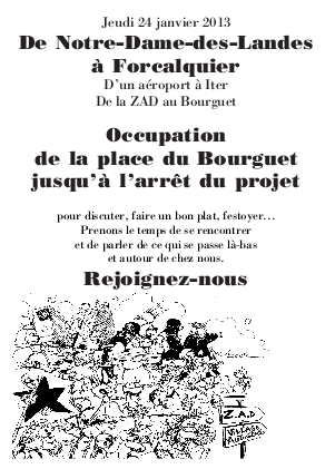 [Jeudi] vers 18h, deux cent personnes environ se sont rassemblés sur la place du Bourguet à Forcalquier, pour une occupation de l’espace public en solidarité avec les camarades de Notre Dame des Landes et avec les luttes menées ici et là bas. Une cabane à été montée en moins d’une demie heure, capable de faire passer la nuit au chaud à 6 personnes. Projections assurées par vos serviteurs, cuisine mobile et grillades, musique et infokiosque de première classe, la place est restée animée toute la nuit. Ce matin, dès l’aube la relève a été assurée, et le campement s’est installé pour durer. Les gendarmes sont passés et repartis, la cuisine tourne. Radio zinzine est venu installer son camion mobile qui vous permettra de suivre les aventures de la zad en direct sur radiozinzine.org. L’occasion de discuter avec les passants, de Notre dame des Landes et de son projet d’aéroport, mais aussi de ITER, de l’école, du puçage des moutons,... Bref une agora à ciel ouverte qui devrait se généraliser partout !! Rejoignez nous ! Vite !!