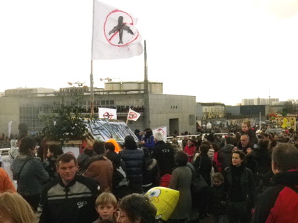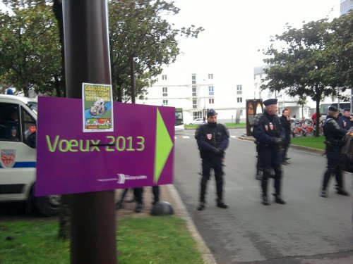 Hier, lundi 28 Janvier 2013 Manuel Valls était invité par le parti socialiste d’Asnières/Seine pour présenter ses voeux aux élus et aux habitants. Devant l’espace Concorde (lieu de la cérémonie) il y avait déjà une manif’ de soutient aux sans papiers, bien encadrée par les robocops. Je me suis assis à l’intérieur de la salle parmis les supporter de Manuel Valls et de sa politique. Après une douloureuse première partie musicale interminable, un groupe de reprise saccageant du Stevie Wonder entre autre et puis le défilé habituel aux pupitres des sous fifres locaux se congratulant les uns les autres, arrive enfin sur scène la star : Manuel Valls. A ce moment je me lève et crie : "Non à l’aeroport de Notre Dame des Landes ! Vive la Zad !" Puis d’autres manifestant anti corrida ou pour la libération de Georges Abdallah se manifestent à leur tour. On s’est tous fait sortir de la salle, relevé d’identité. Ensuite on a ensuite été rassemblé dehors pendant une heure puis tout le monde a été relaché.