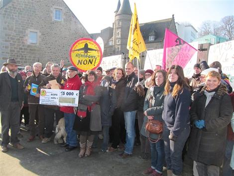 À l’issue du rassemblement, la Confédération paysanne, membre du comité de soutien aux opposants à l’aéroport a remis un chèque de 15 000 € à l’Acipa (Association citoyenne intercommunale des populations concernées par le projet d’aéroport). Cette somme a été réunie grâce à la vente de 30 000 bouteilles de bière, étiquetées « Non à l’aéroport ! ».