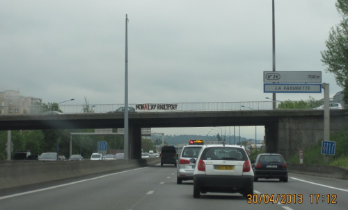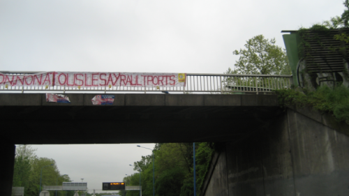Mardi 30 avril : Décoration de la rocade de Toulouse Plusieurs banderoles portant des slogans de soutien à la ZAD et hostiles à l’ayraultport ont fait leur apparition simultanée à divers emplacements au-dessus du périphérique de Toulouse.