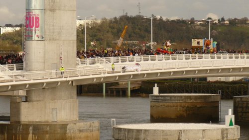 Parade annonçant la chaine humaine de Trellières au centre de Nantes.