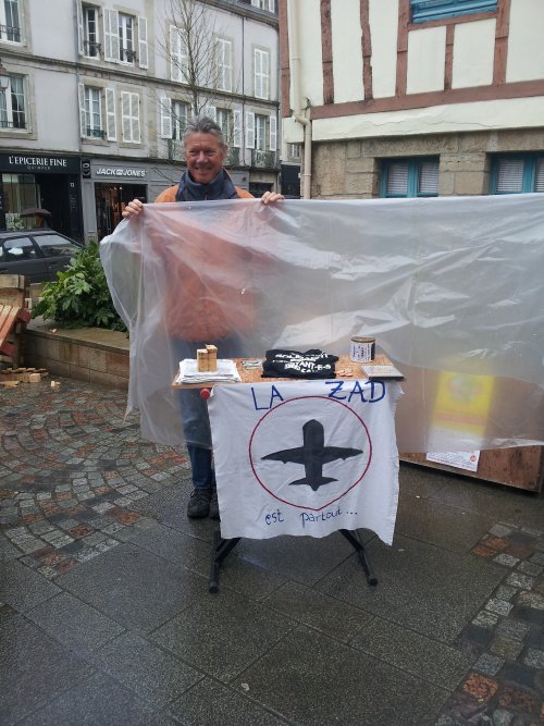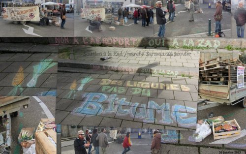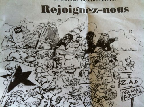 Nous avons fait un stand de crêpes sur le marché du jeudi ce matin qui jusqu’ici s’est bien déroulé. En soutien à NDDL bien entendu. Les habitants du coin, issus pour la plupart de familles d’agriculteurs sont assez réceptifs à la question du bétonnage des fermes, bien que souvent résignés.