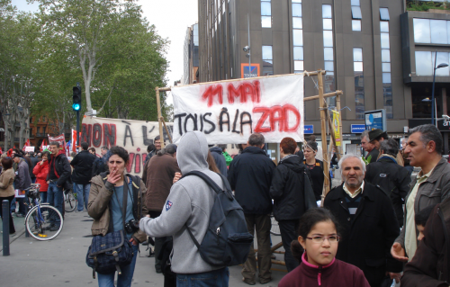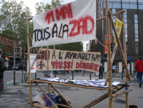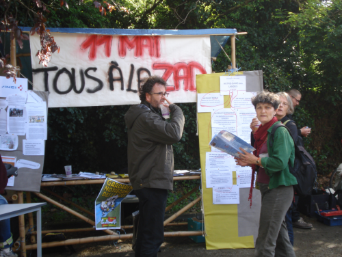 Un stand en bambou proposant des lectures militantes et des informations sur le week-end du 10-12 mai est installé sur le passage du cortège de la manifestation. Une grande banderole est également déployée. S’ensuivent de nombreuses et riches discussions sur le thème de la lutte contre les Grands Projets Imposés avec les passants. C’est l’occasion de récolter quelques fonds (documentation à prix libre) et d’informer sur les départs en bus pour la chaîne humaine du 11 mai.