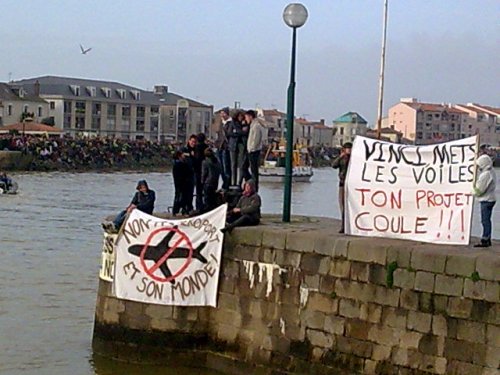 Trois Comités de Vendée (CLAM, Comité de la Roche, Comité des Olonnes) étaient présents lors de l’arrivée du skipper du Vendée globe dimanche 27 janvier. L’objectif était de faire une opération médiatique afin que nos slogans soient visibles par les caméras nationales des deux côtés du chenal. Malheureusement, les banderoles ont été déroulées trop tôt et la gendarmerie est intervenue pour les faire enlever, avec parfois l’aide du public mécontent. Malgré une petite tentative d’intimidation de la part des services des Renseignements Généraux, nous avons tout de même réussi à faire une "levée" de banderoles sur les quais de la Chaume de sorte que des milliers de spectateurs qui quittaient le lieu ont pu voir nos slogans. Certains applaudissaient et nous encourageaient. C’est toujours ça !!