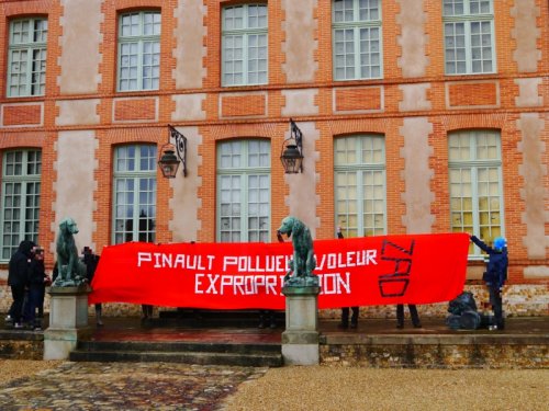 Pour dire toute la vérité, nous ne nous sommes pas attardéEs. Après avoir expliqué l’objet de notre présence aux employéEs du (multi)milliardaire (sa fortune personnelle est de 8,1 milliards d’euros, soit 472 000 années de SMIC), nous sommes très vite repartiEs en criant quelques slogans bien à propos : « Pinault, pollueur, voleur, expropriation ! » Rien de bien méchant en somme...