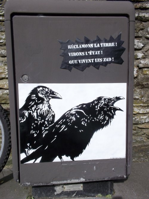 Quelque part : pochoirs "Réclamons la terre, virons l’État, que vivent les ZAD"