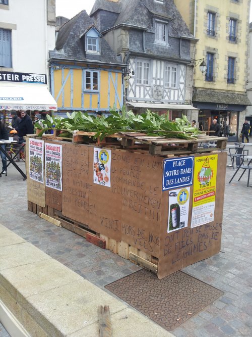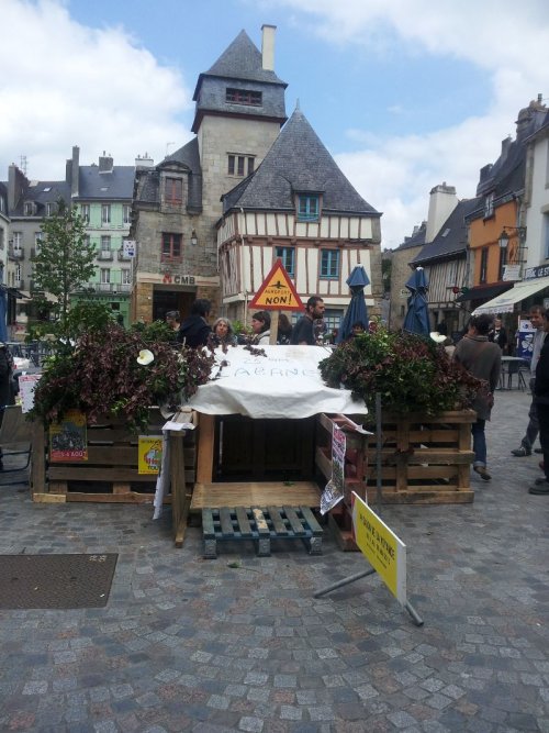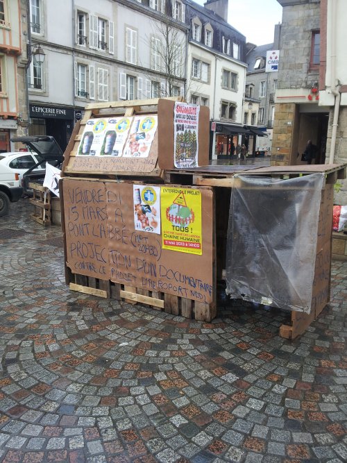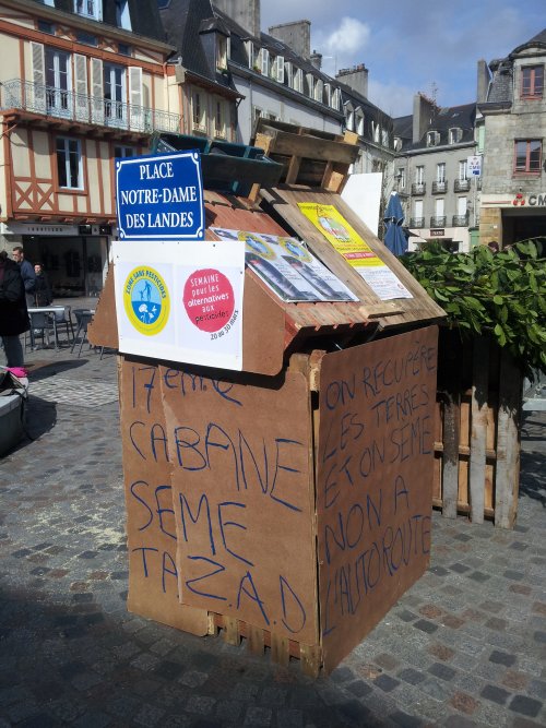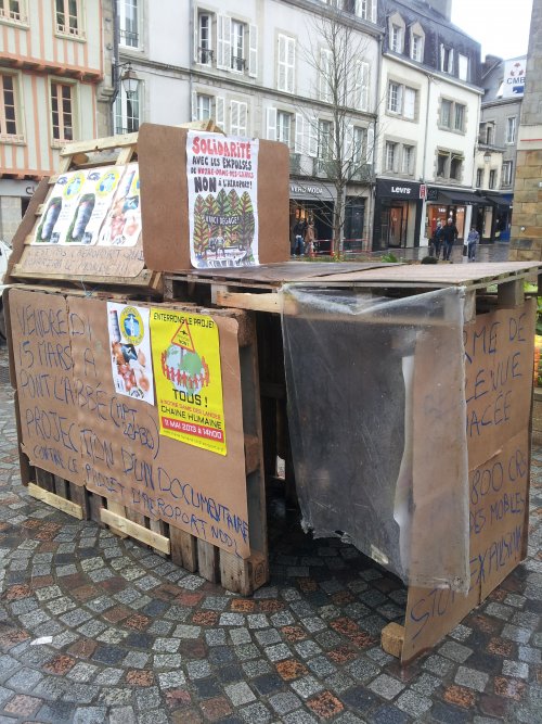 10 cabanes..... Elles sont construites depuis 10 semaines, et enlevées par la mairie le dimanche matin, voir le lundi..... les employés municipaux, depuis le début, ont refusé de l’enlever le samedi.....Place Terre au Duc.... Haut lieu de résistance à Quimper..... "Nous continuerons à construire une cabane tous les samedi matin place Terre au Duc, jusqu’à ce que le projet finisse dans le caniveau"....