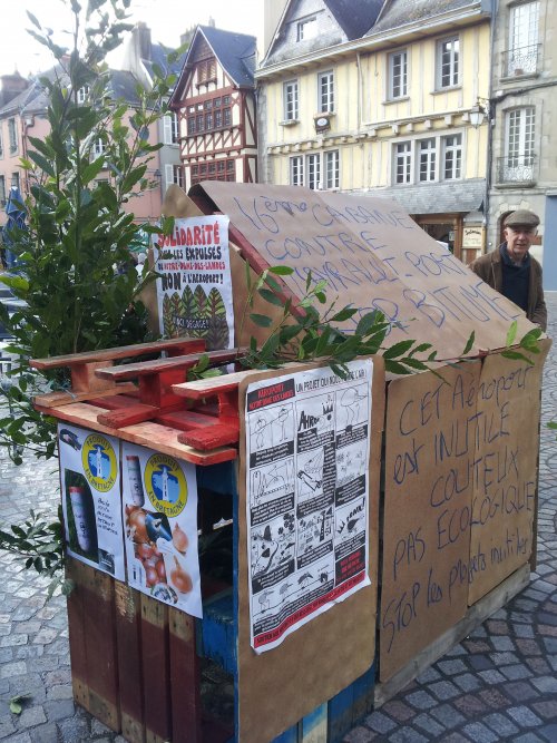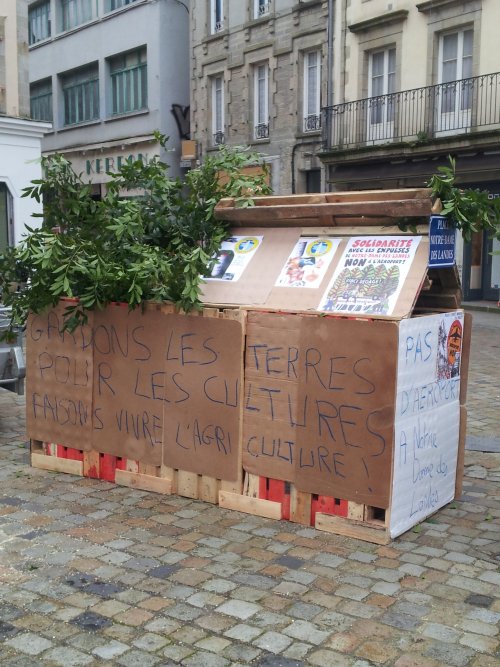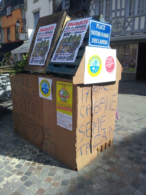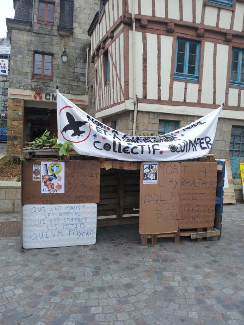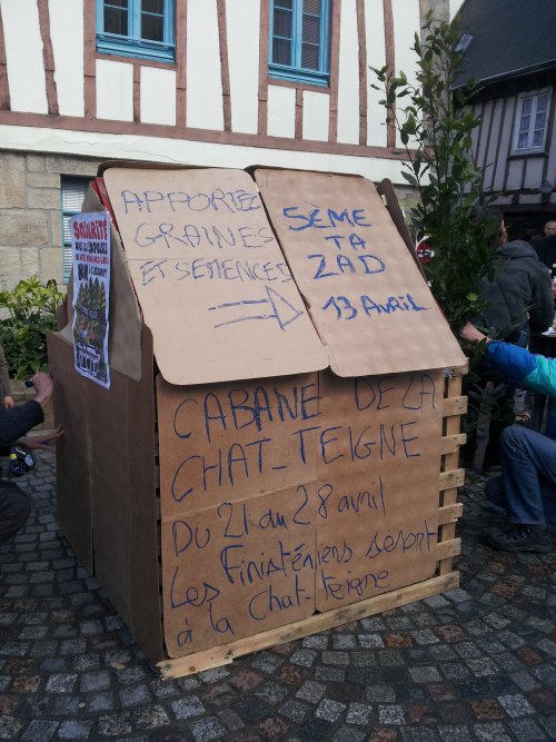 Le collectif de Quimper a construit sa 18éme cabane devant la mairie de Quimper en soutien a NDDL et aussi contre la futur déstruction de terres agricole a Quimper nord avec la construction d’un éniéme magazin de bricolage dont nous n’avons pas besoin !!!