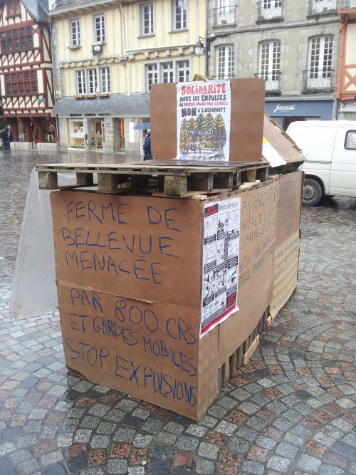 Et oui nous revoila comme chaque semaine ont lache pas et ont lachera rien ! Même si ce matin la place était bien flicé pour nous dissuader de nous installer ! Le collectif de Quimper a construit sa 16éme cabane. A Bientôt les amies.