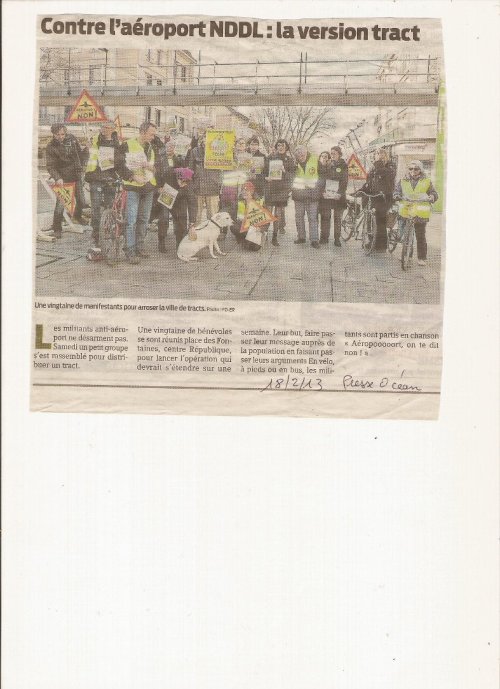 "Des membres de Chenapan, collectif du pays d’Ancenis contre le projet d’aéroport, ont manifesté ce matin à l’entrée d’Ancenis sur la RD 723. Autour du rond-point, une cinquantaine de personnes ont arboré des banderoles pour marquer leur opposition à la construction de l’équipement à Notre-Dame-des Landes. Elles ont distribué des tracts aux automobilistes pour les informer de la chaîne humaine qui aura lieu samedi 11 mai à l’initiative de l’ACIPA autour du site du futur aéroport." (Ouest France)