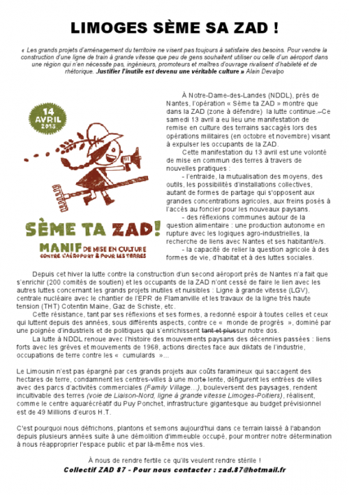 Dimanche 14 avril, suite à l’appel Séme ta ZAD du 13 avril, à Notre-Dame-des-Landes, un terrain abandonné depuis des années, promis à un parking, a été mis en culture en plein centre ville à Limoges, rue de la Corderie, en face du conseil régional. Il est depuis occupé, bêché, semé, planté, aménagé comme lieu collectif de vie, de partage et de création. Samedi 20 avril, à partir de 15 heures, aura lieu un rassemblement de soutien sur le terrain avec invitation des voisins. Amener vos plantes, vos bons plats, vos outils, vos planches, vos clous, un abri-cabane y sera construit.