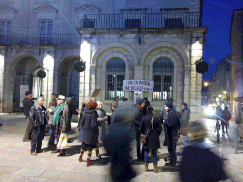 Récit du rassemblement : à partir de 18h, des gens de tous âges commencent à se rassembler place des Otages à Morlaix, devant la mairie, ce lundi 25 janvier 2016. Nous sommes à vue d’oeil une centaine, nous discutons et échangeons les informations sur le rendu du référé-expulsion. Une banderolle, quelques drapeaux d’avions barrés, du "Vinci dégage" sur carton, une dizaine de marmots, un ou deux RG connus... et puis, au consentement général on décide de marcher ensemble tout autour de la place, ralentissant fortement la circulation pendant une bonne heure. Quelques commerçants sortent sur le pas de porte, ils nous demandent ce que l’on fait et nous disent que c’est bien qu’on le fasse. On passe devant le local Vinci local, que l’on décore gaiement de quelques affiches. On se redit que nous sommes prêts en cas d’expulsions manu-militari, on se re-brieffe sur les actions mises au point en inter-comité finistère, échangeons sur les prochains rendez-vous