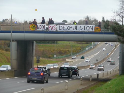 La première action a eu lieu vendredi avec affichage de banderole contre les expulsion sur un pont de la 4 voies et distribution de 1000 tracts, bonne accueil..