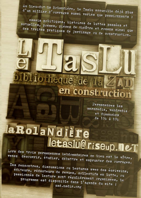 Durant les permanences qui se tiendront les mercredi, vendredi et dimanche de 15h à 19h, les ouvrages seront accessibles à toutes et tous. En ce qui concerne les emprunts, pour juguler les risques de non retour, ils seront circonscrits aux personnes habitant à la zad ou dans les alentours. Nous tenons cependant à ce que cette bibliothèque, par la qualité et l’abondance de ses ouvrages, puisse être une des nombreuses portes d’entrée sur la zone. Le Taslu sera une pièce accueillante, propice à l’étude, où le curieux pourra musarder d’une quatrième de couverture à l’autre ou encore demeurer accroché au fil d’un récit palpitant durant toute une après-midi pluvieuse.