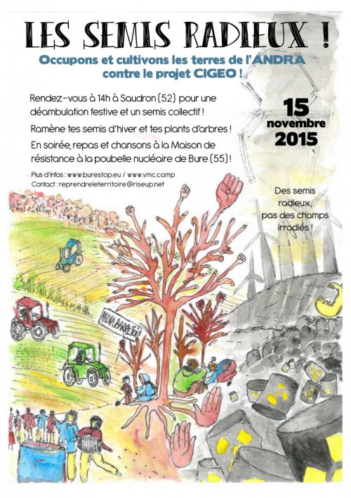 Depuis fin septembre l’ANDRA intensifie ses travaux préparatoires à la poubelle nucléaire avec des fouilles archéologiques qui lacèrent des dizaines d’hectares de terres agricoles (http://vmc.camp/2015/10/02/sur-les-travaux-en-cours/)… Nous, nous répondons par une occupation collective et joyeuse des terres pour enraciner notre résistance !