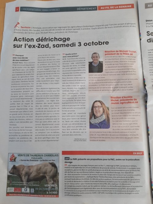 (1) https://www.ouest-france.fr/pays-de-la-loire/notre-dame-des-landes-44130/notre-dame-des-landes-le-coup-de-gueule-des-agriculteurs-historiques-de-l-ex-zad-cd1bd0de-048a-11eb-a7ed-96a005cb5c0d + interview de Mickaël Mary porte-parole de l’Amelaza dans le journal local de la FNSEA, capture d’écran disponible sur zad.nadir.org et sur le facebook zad nddl info