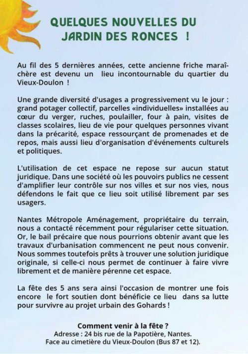 Accueil > Camarades de lutte > Autres luttes contre l’aménagement capitaliste du territoire > Les 5 ans du jardin des Ronces